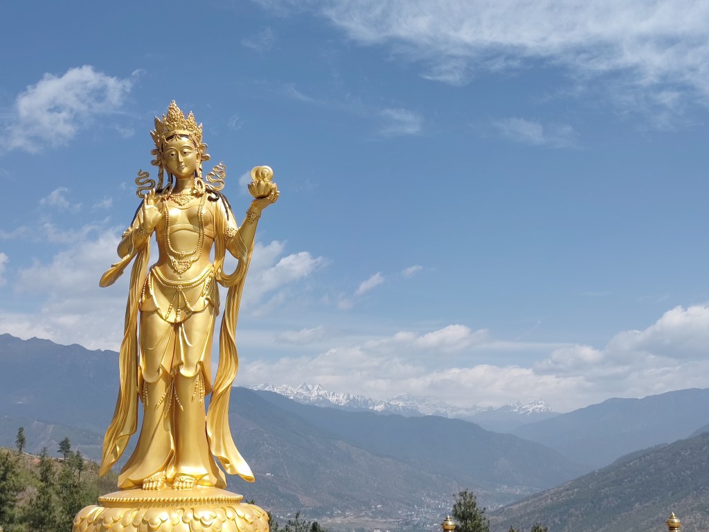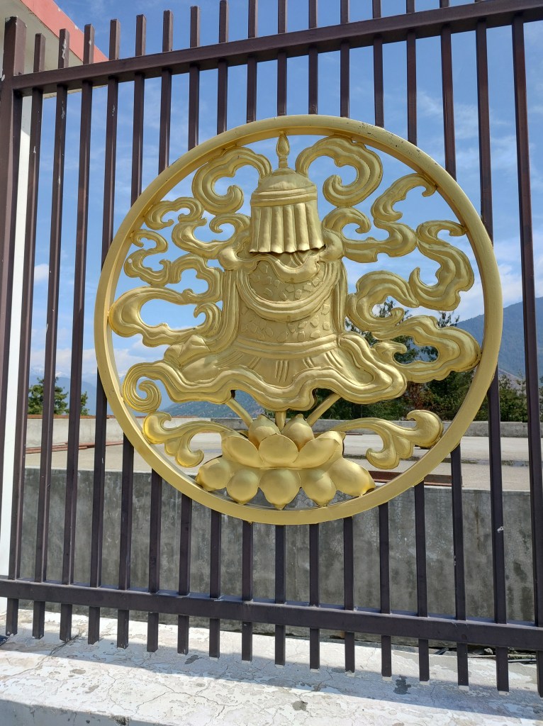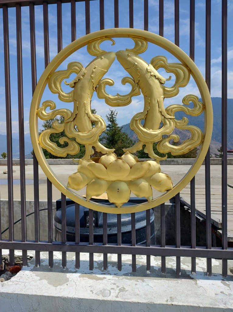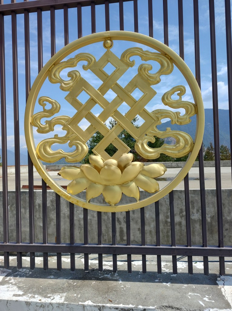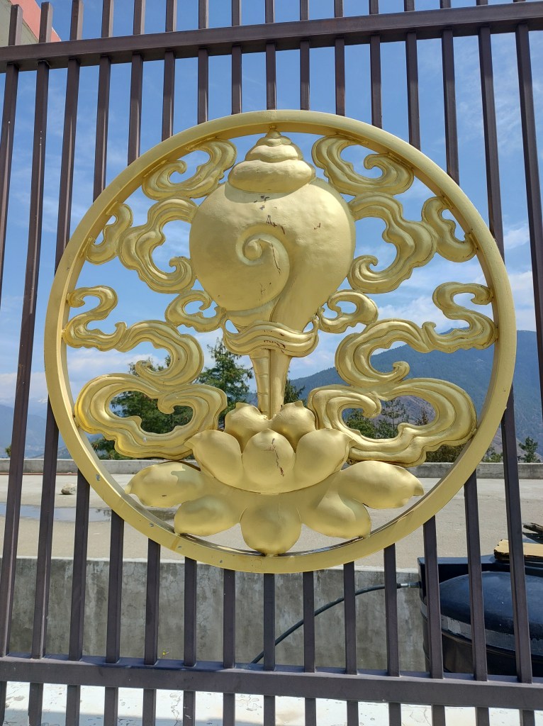 While in Thimphu, also visited Shakyamuni Buddha. The locale overlooks the Thimphu Valley and has a huge metallic statue of Buddha, built for world peace. Very scenic and peaceful place. The Buddha statue is surrounded by large statues of goddesses all around. Hollow statue has a floor inside which is like a temple. Saw Ganesha statue in this place. Few pics from this place below. Also see pics of eight key symbols in Buddhism – the Wheel of Law, a conch shell, a victory banner, an umbrella, a lotus flower, a vase, a pair of fish, and an endless knot.