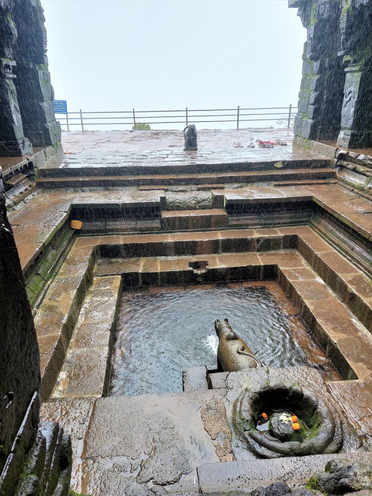 First temple visited was Sri Mahabaleshwar temple on a hill top. Temple dedicated to Lord Shiva. For once, we could drive right up to the temple. Different from the Hoysala, Vijayanagara or the Chola temples in the south. The temple in its shape today was built in 16th century and follows the hemadpanti (correction pointed out by my architect cousin) style of architecture. No adornments outside except the Pyramid shaped top. It is the place where Chatrapati Shivaji donated gold equal to weight of his mother to the poor. An image taken in the rains below.